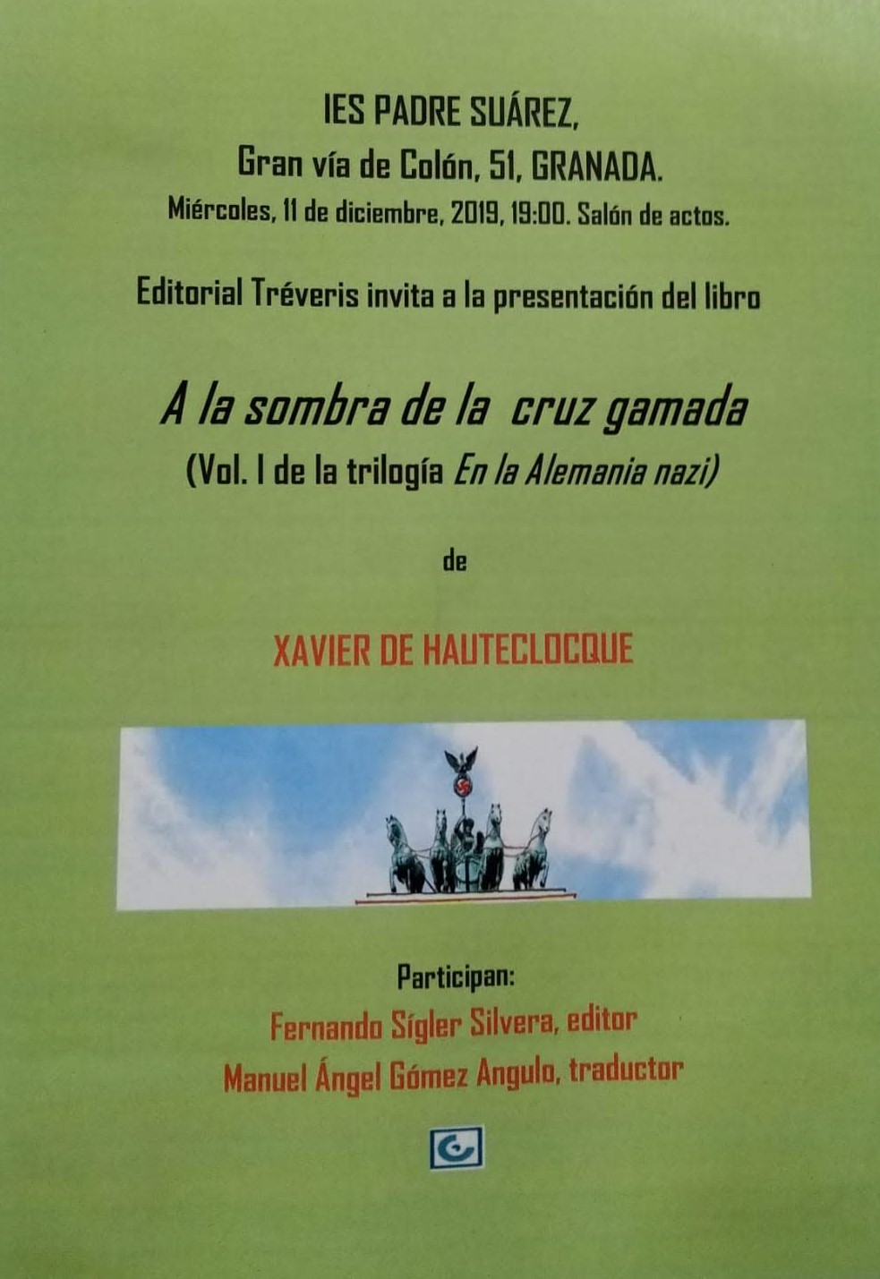 El miércoles 11 de diciembre de 2019, a las 19 horas, se presenta en el salón de actos del Instituto el libro A LA SOMBRA DE LA CRUZ GAMADA, de Xavier de Hauteclocque, con traducción del francés al castellano, notas al pie y nota final de D. Manuel Ángel Gómez Angulo. Esta novela, editada por Editorial Tréveris, es el volumen I de una trilogía del mismo autor, titulada EN LA ALEMANIA NAZI. Esta edición se abre con un prefacio de D. Pedro Bohórquez Gutiérrez.